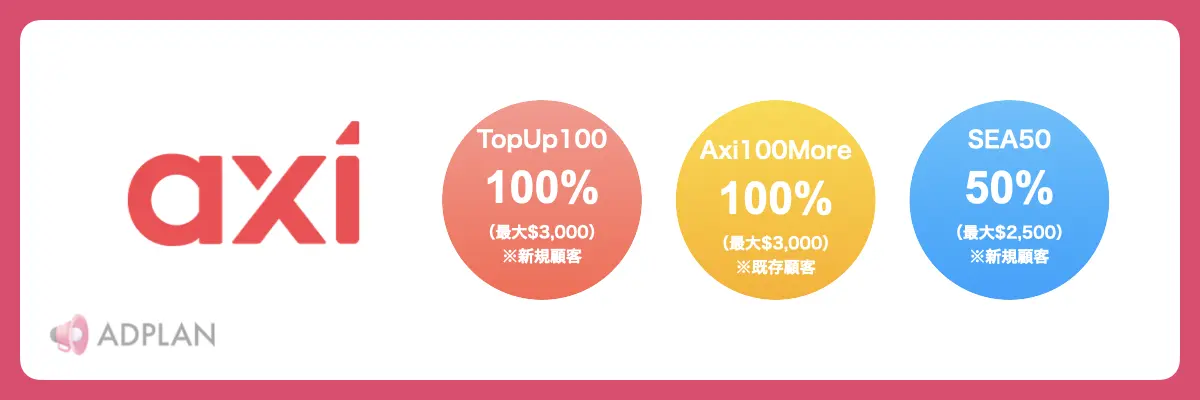 | AXIORY | 100%ボーナス(6万円) | ボーナス詳細へ | レビュー記事へ |