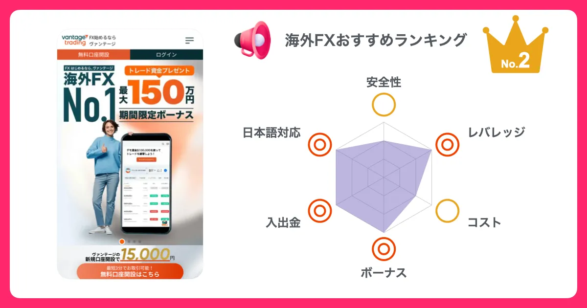 | 8位 | ![]() 詳細を読む | スプレッドが狭く約定力が優秀。出金が速いのが特徴。 Vantageグループの一社。 | 口座開設へ |