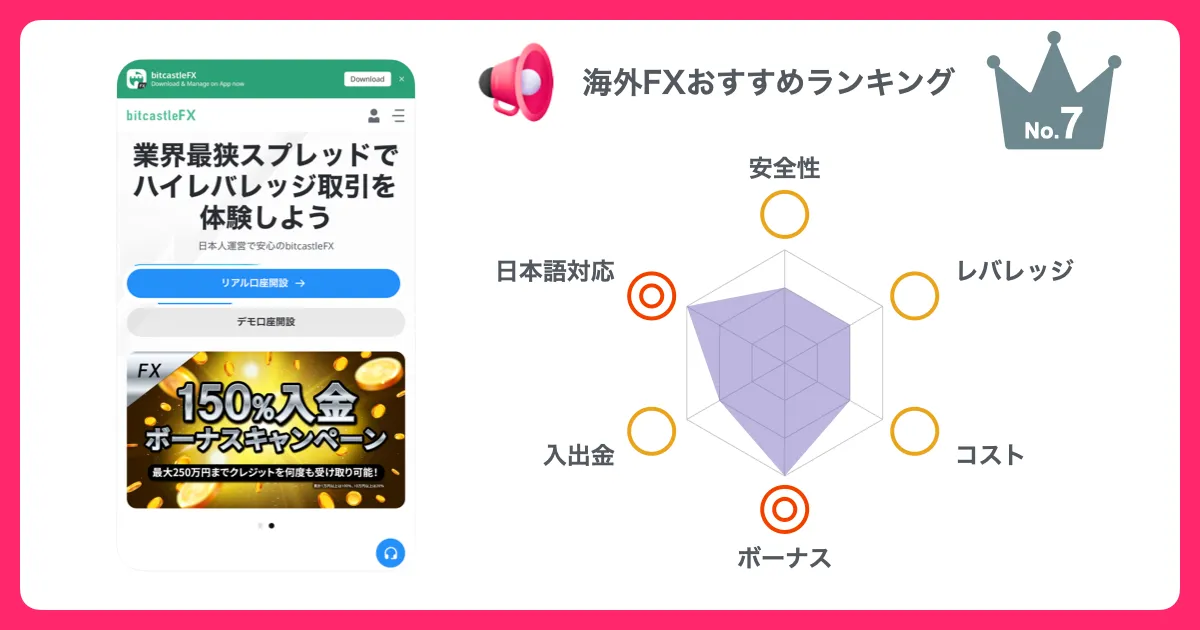 | 7位 | ![]() 詳細を読む | 日本人開発の新興業者で運営実績はまだ浅い。 仮想通貨対応が充実し、高額ボーナスを提供。 | 口座開設へ |