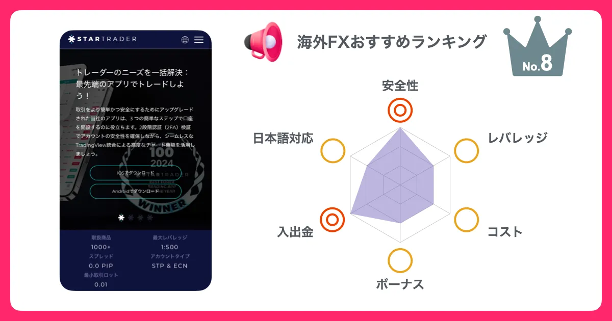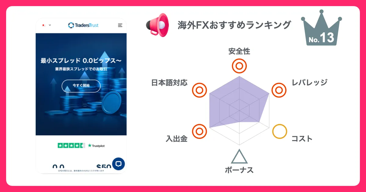 | 19位 | ![]() 詳細を読む | 老舗で信託保全ありで、プロトレーダーに人気。 MT4/MT5/cTraderに対応するが、レバレッジは控えめ。 | 口座開設へ |