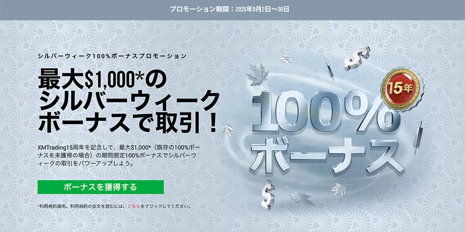 XMTradingのシルバーウィーク100%ボーナスプロモーションは、2025年9月2日15:30から2025年10月1日05:59(日本時間)までの期間限定キャンペーンです。